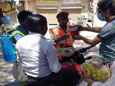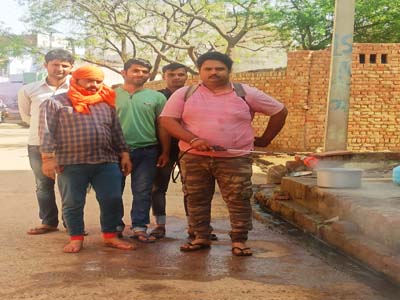 सौंख के गांव आजल में कोरोना वायरस को लेकर सैनेटाइजर का छिड़काव करते समाजसेवी भूपेंद्र चैधरी व अन्य