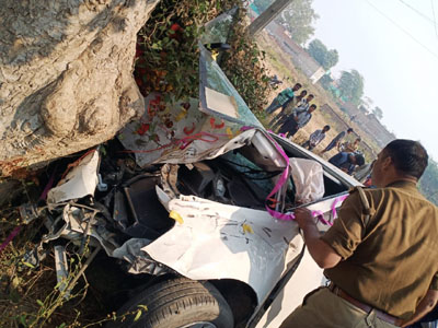 यमुना एक्सप्रेस वेः कंबाइन में जा घुसी कार, महिला की मौत, पति घायल