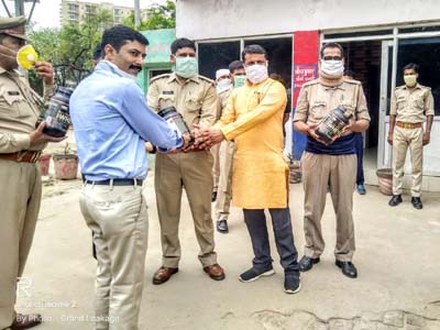 अक्षयपात्र के सलाहकार ठाकुर प्रकाश सिंह पुलिसकर्मियों को इम्यूनिटी पावर बढाने वाले प्रोटीनयुक्त पदार्थ सौंपते हुए।
