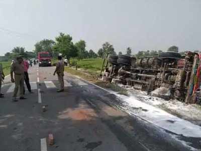 पैट्रोल लेकर जा रहा टैंकर पलटा, मची अफरा तफरी